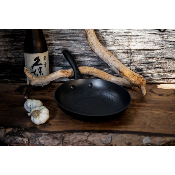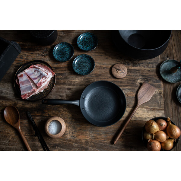 Eine weitere Neuheit sind die mattschwarzen Griffe und Details. Vielleicht die schönste Bratpfanne der Welt? Die wabenförmige Oberfläche verteilt die Wärme gleichmäßig und sorgt für eine perfekte Oberfläche der Zutaten. Eine hervorragende Pfanne für alle Arten des Bratens – Gemüse, Fisch und Fleisch.