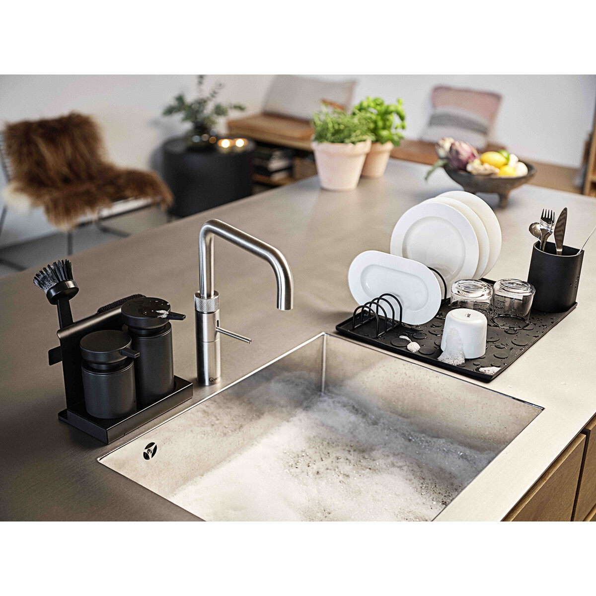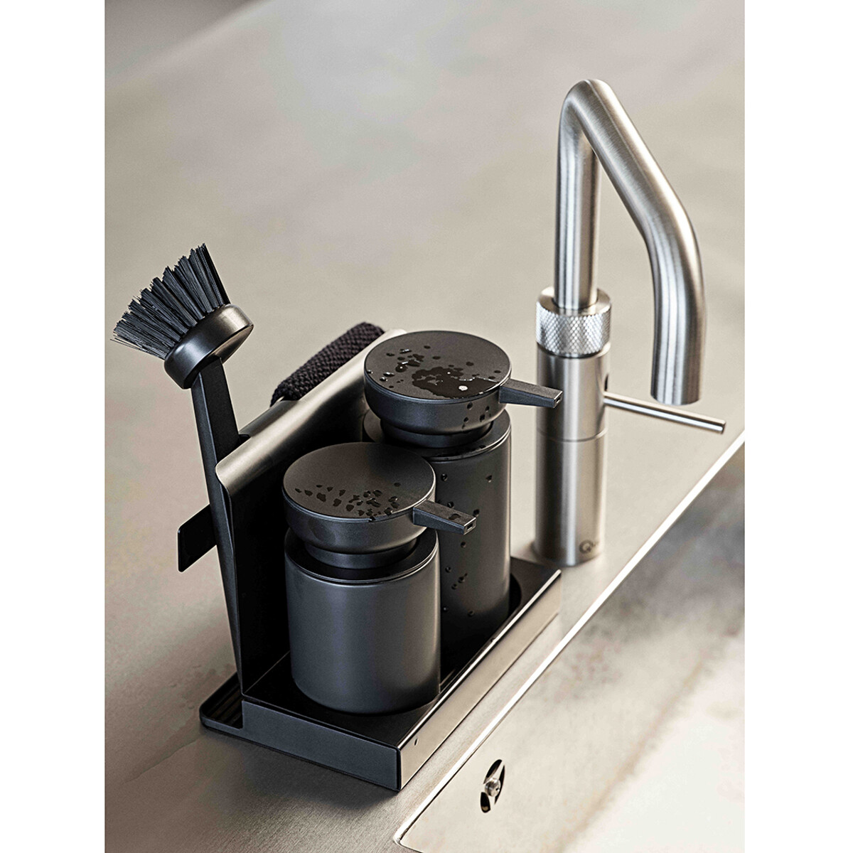 Im Vordergrund steht das Pumpduo für Spülmittel und Handseife/Handdesinfektionsmittel. Beide sind aus Keramik gefertigt. Im Hintergrund hängt das gestrickte Spültuch diskret zum Trocknen, bis es wieder verwendet wird. Dazu gibt es eine Bürste in passender Farbe. Ein letztes schönes Detail ist das kleine Tablett, das überschüssiges Wasser auffängt, damit es nicht auf dem Küchentisch landet.