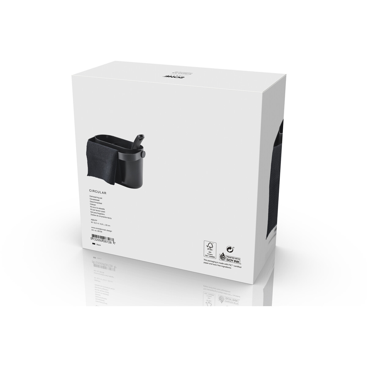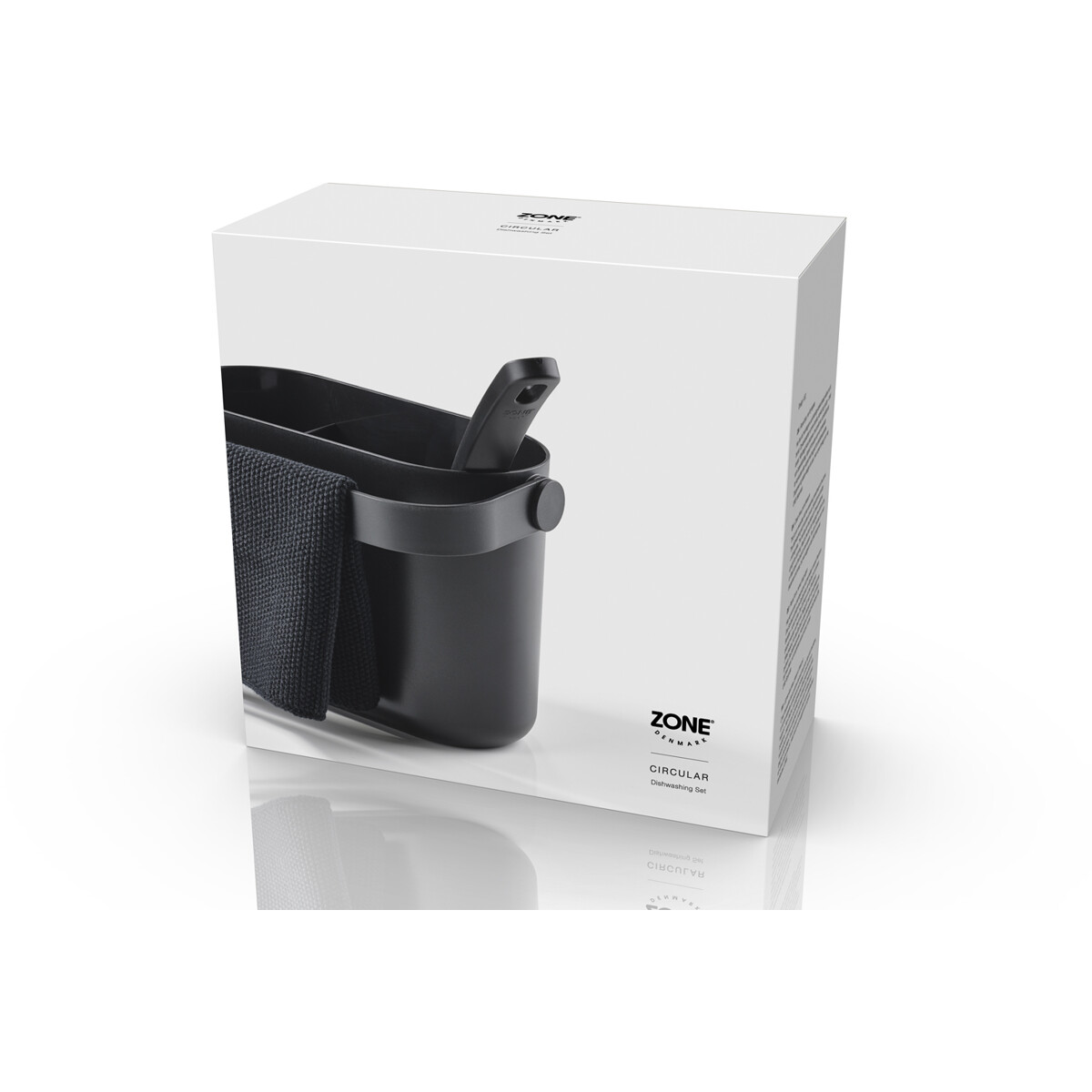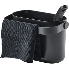 Das Geschirrset enthält eine Bürste, ein Spültuch und einen Caddy. Der Griff kann in drei Positionen platziert werden – aufrecht als Tragegriff, nach vorne geklappt als Trockenplatz für das Spültuch oder nach hinten geklappt, um Platz zu sparen.