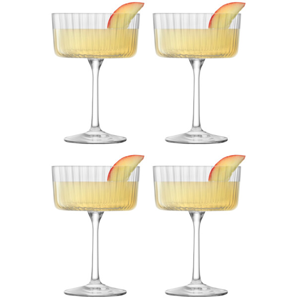 Ein Set mit vier Champagner-/Cocktailgläsern mit fein strukturierten Wänden, modernem Design und entspannten Stielen. Zum Servieren von Champagner, Prosecco und Cocktails. Modernes, utilitaristisches Design. Lineare, strukturierte Oberfläche. Glatte Innenseite.