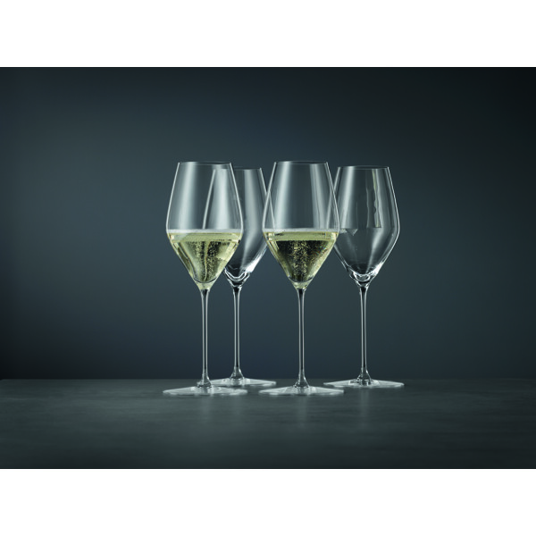 Entdecken Sie die Champagnergläser von Spiegelau, die speziell entwickelt wurden, um die komplexen Eigenschaften von Champagner und Schaumweinen hervorzuheben und zu verstärken. Dieses Glas hat ein diamantförmiges Design, das ein breites Spektrum an aromatischen Profilen entfalten lässt, dank der extremen Winkel, die mehr Raum für die Entwicklung der Aromen bieten. Der breitere Kelch lässt die komplexen Schichten wachsen und sich intensivieren, während die größere Öffnung die Aromen auf eine Weise freisetzt, die schmalere Gläser wie Flöten nicht erreichen können. Der "Sparkling Point" des Glases hilft bei der Bildung von Blasen, was das visuelle und geschmackliche Erlebnis verstärkt.