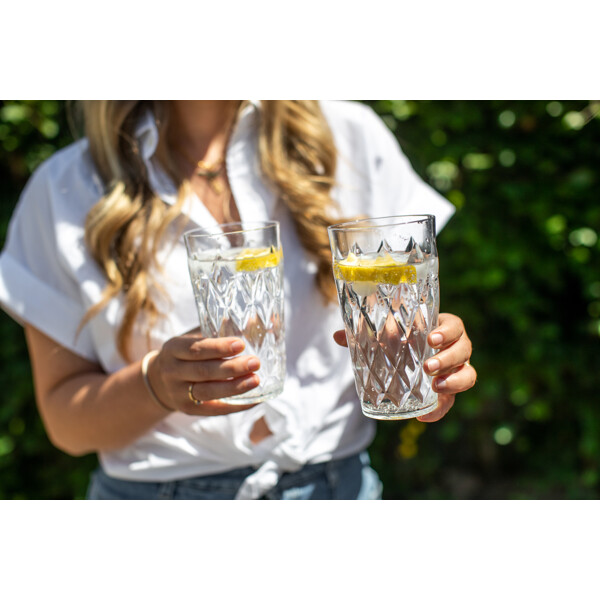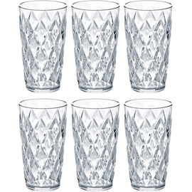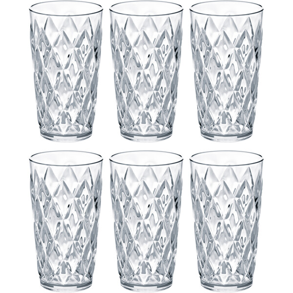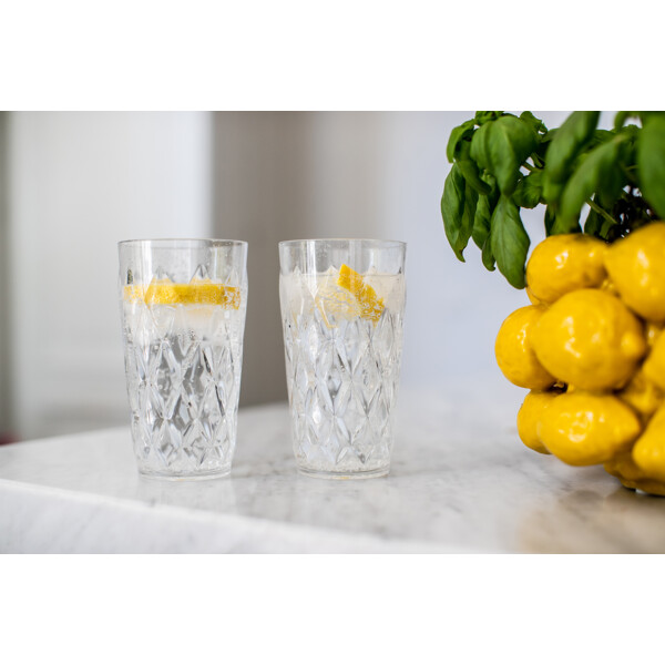 Schönes Trinkglas aus unzerbrechlichem, ungiftigem und 100% recycelbarem Thermoplast von Koziol. Perfekt sowohl für den Alltag als auch für Feste. Schönes Glas für Drinks auf Sommerpartys im Freien.
