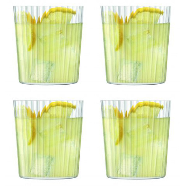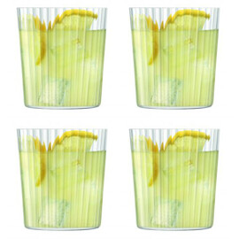 Set mit vier niedrigen stapelbaren Trinkgläsern mit linearer Struktur. Die vielseitige Form kann auch als Schale für Nüsse und Oliven verwendet werden.