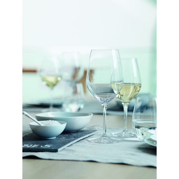 Weißweingläser haben generell einen kleineren Kelch als Rotweingläser. In zu großen Kelchen wird der Wein warm, da Weißwein am besten leicht gekühlt genossen werden sollte.