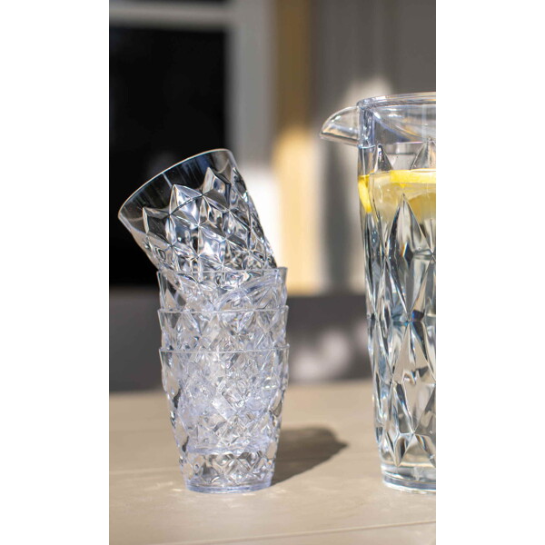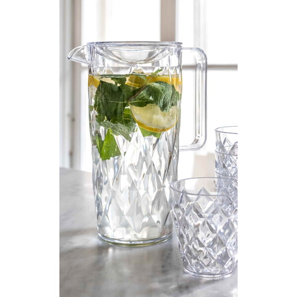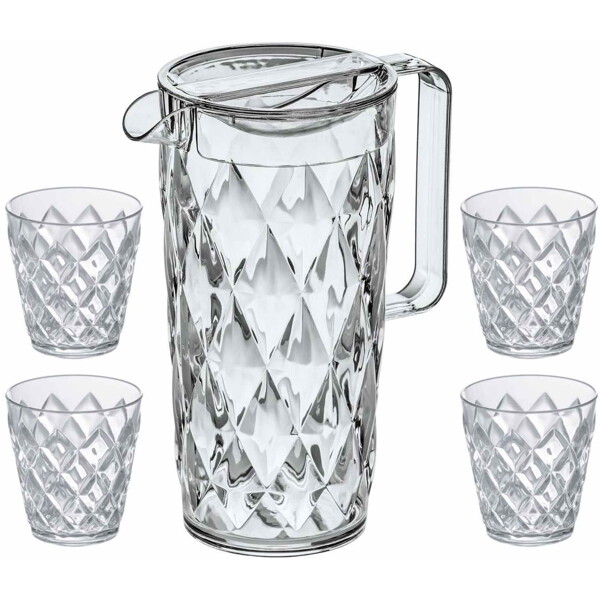 Schickes Set mit CRYSTAL Wasserkaraffe 1,6 Liter und vier passenden Gläsern. Die Karaffe und die Gläser gehören zur unzerbrechlichen Plastikglas-Serie Superglas von Koziol, hergestellt aus 100% recycelbarem und giftfreiem Thermoplast. Umweltfreundliches Design und hergestellt in Deutschland.