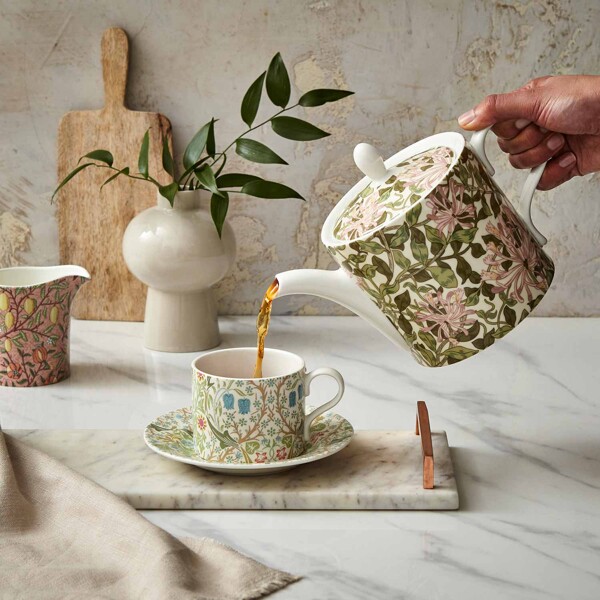 Morris & Co Honeysuckle Teekanne 110cl. Teekanne mit schönem Muster von Morris & Co. Perfekt für das Frühstück, die Kaffeepause oder wenn Sie sich etwas Besonderes gönnen möchten. Die Teekanne ist das Ergebnis einer Zusammenarbeit zwischen Spode und Morris & Co, das schöne Muster ist das Resultat.Volumen: 110 cl.