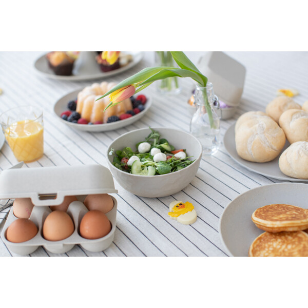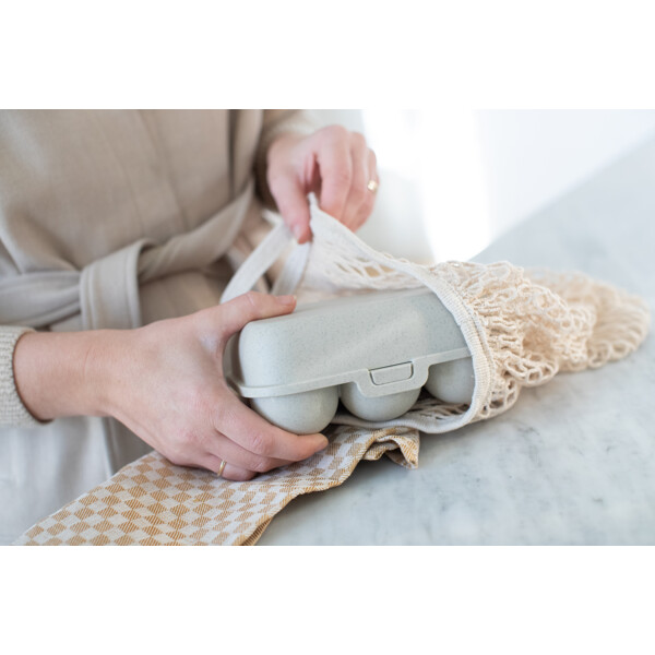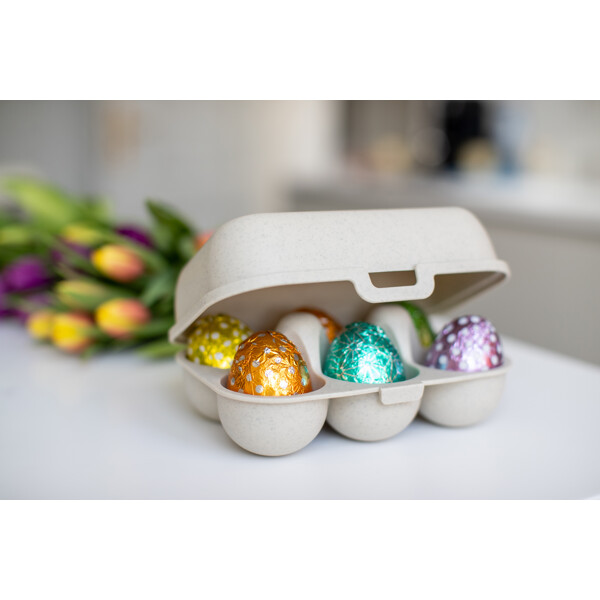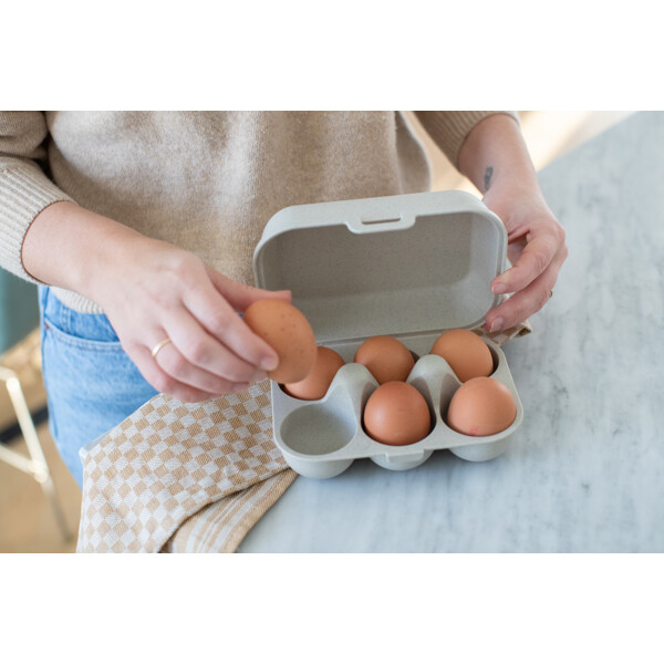 Eierkarton für 6 Eier, hergestellt aus 100% recycelbarem umweltfreundlichem biokreisförmigem Thermoplast und Holzfaser - perfekt für den Einkauf auf dem Bauernmarkt. Die Box ist sicher und stabil und hat einen Deckel mit Klickverschluss. Das stoßresistente Material hält die Eier garantiert ganz. Stapelbar, sodass Sie Platz im Kühlschrank sparen.