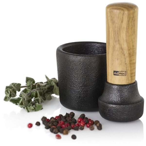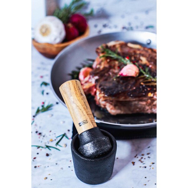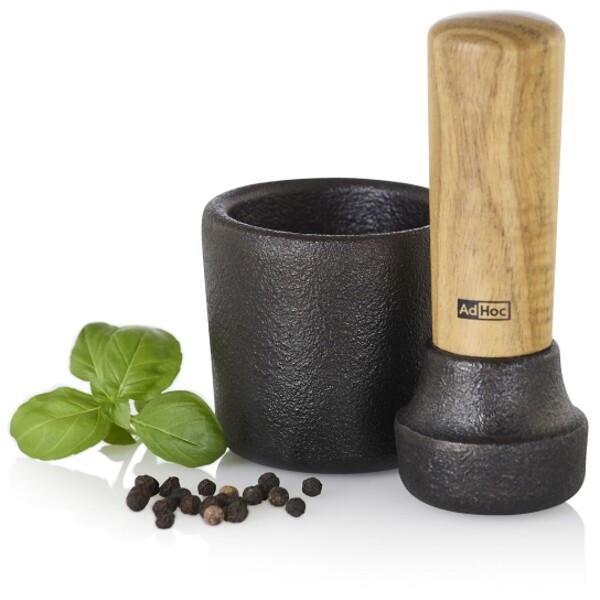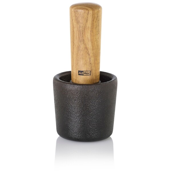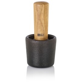 Hochwertiger Mörser aus Gusseisen und Akazienholz. Perfekt für Salz, Pfeffer und andere granulierte Gewürze. Das manuelle Mahlen sorgt für ein intensives Aroma. Durchdachtes Design und praktische Größe für das Kochen am Tisch.