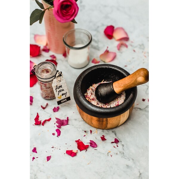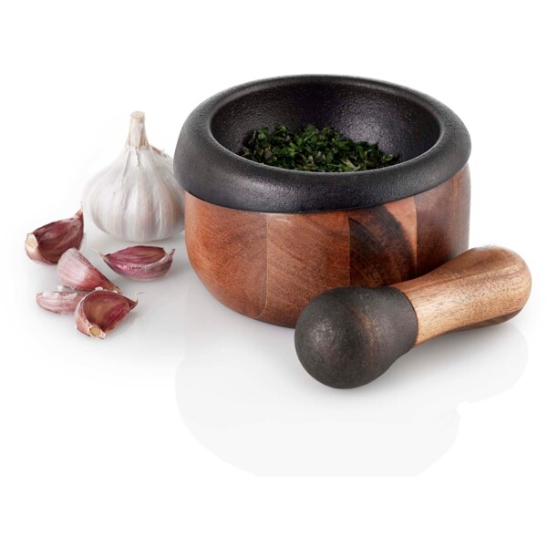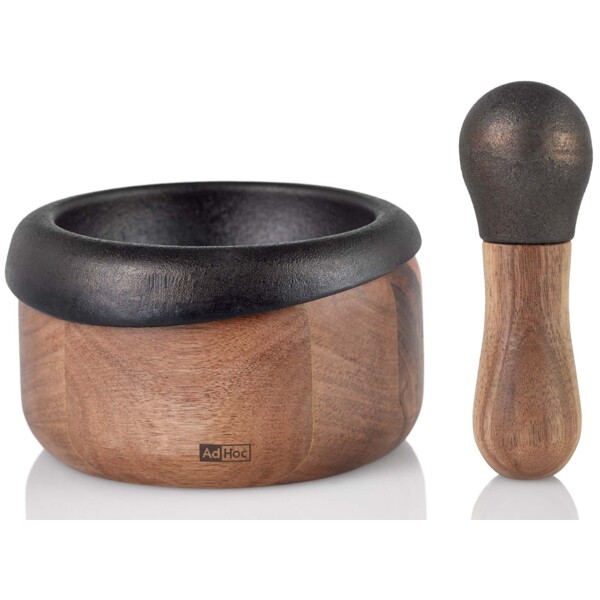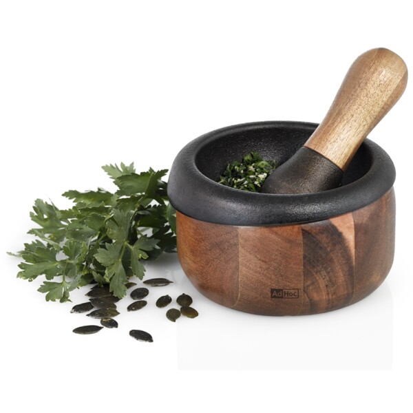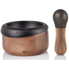 Hochwertiger Mörser für die traditionelle Zubereitung. Einfaches Zerkleinern, Mahlen und Stampfen. Die Schleifflächen bestehen aus hochwertigem Gusseisen und der Griff aus Akazienholz.