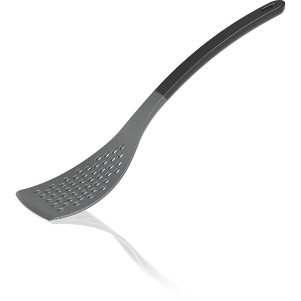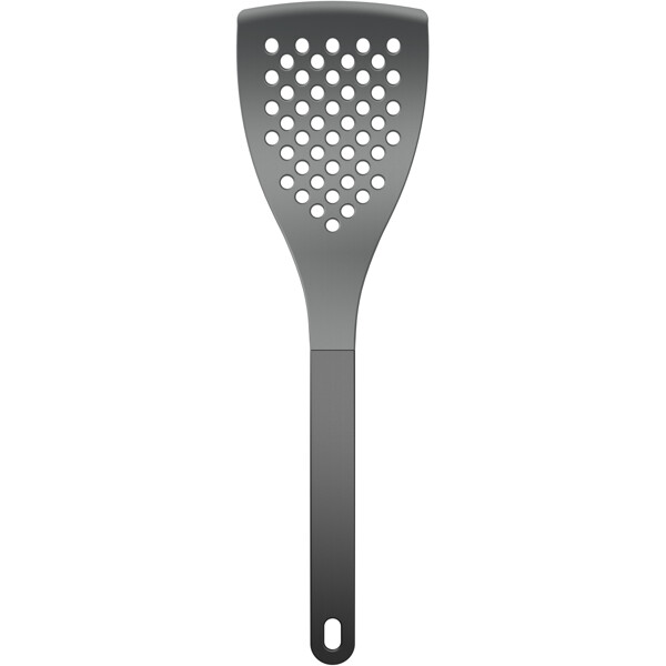 Große Palette mit farbigem Griff, 31 cm. Die Klinge ist perforiert und mit einer Breite von 8,5 cm eignet sich die Palette zum Umgang mit größeren Lebensmitteln in der Pfanne, sowohl Fleisch als auch Gemüse. Hergestellt aus Nylon, das schonend zu beschichteten Töpfen und Pfannen ist und hitzebeständig bis 220 Grad C. Schlankes und ergonomisches Design mit praktischem Aufhängeloch. Spülmaschinenfest.