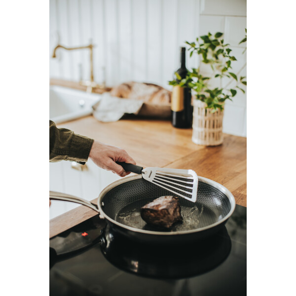 Dieser 33 cm lange Pfannenwender kombiniert Funktionalität und schonende Handhabung. Die silikonbeschichtete Spitze schützt Ihre Antihaftpfannen und empfindlichen Kochgeschirre vor Kratzern und ermöglicht gleichzeitig eine effektive und reibungslose Nutzung. Perfekt zum Wenden von Pfannkuchen, Omeletts oder empfindlichen Gerichten wie Fisch und Gemüse. Mit seiner Länge von 33 cm ist er ideal sowohl zum Kochen als auch zum Servieren. Der ergonomische Griff bietet einen bequemen Halt, was die Verwendung auch bei langen Kochsessions erleichtert.