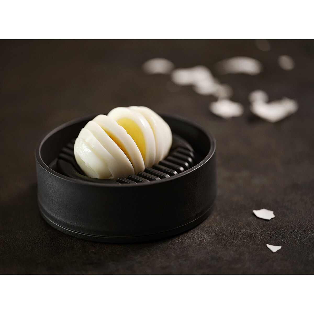 Einfacher und eleganter Eierschneider von Zone Denmark, der garantiert Ihre Lust auf Sandwiches steigert. Er ist nicht nur ein effektives Werkzeug, das das Ei sowohl längs als auch quer teilen kann. Wenn die Messer das Ei in feine Scheiben geschnitten haben, verwandelt sich der Eierschneider in eine hübsche kleine Servierschale, die den Mittagstisch dekoriert.