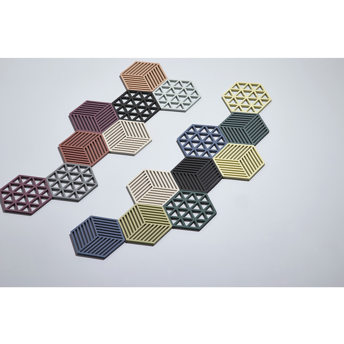 Die Serie wurde von dem Designertrio VE2 entworfen. Hexagon ist in vielen aufregenden Farben erhältlich und lässt sich perfekt mit den Triangles-Topfuntersetzern kombinieren, die die gleichen Außenmaße haben.