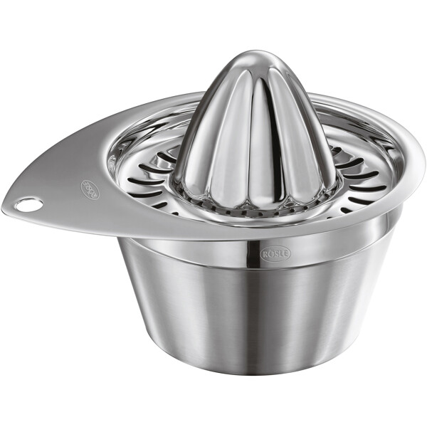 Die RÖSLE Zitruspresse ist so gestaltet, dass sie jeden Tropfen Saft aus Zitrusfrüchten herausholt, mit Ausgießrand. Spülmaschinengeeignet.