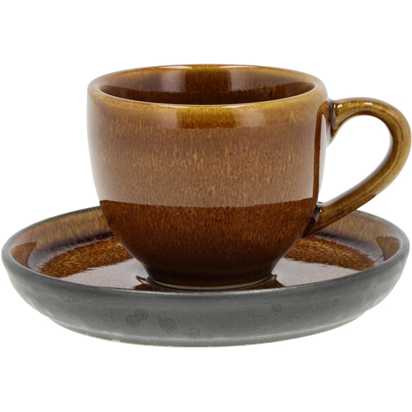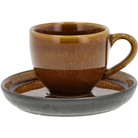 Feine Espressotasse mit Henkel und passender Untertasse aus robustem Steingut. Die Untertasse hat eine matte, schwarze Glasur auf der Unterseite, während die Oberseite die gleiche glänzende, farbige Glasur aufweist, die sowohl außen als auch innen an der Tasse zu finden ist. Fassungsvermögen 7 cl. Durchmesser 5,5 x 5 cm. Das Steingut ist spülmaschinenfest, mikrowellengeeignet und ofenfest bis 220 Grad. Aufgrund des Herstellungsprozesses gibt es sowohl Farbunterschiede als auch Variationen in der Glasur, was jedem Exemplar ein völlig einzigartiges Aussehen verleiht.