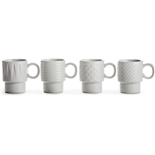 Espressotassen 4er-Pack mit charakteristischem Relief. Die Espressotasse ist Teil der Serie Coffee & More, entwickelt von Sagaform in Zusammenarbeit mit der Designerin Margot Marolo. Das Design der Serie ist eine Hommage an die direkte, verspielte und geradlinige Sprache der 70er Jahre. Die Serie ist in verschiedenen Teilen, Mustern und Farben erhältlich und kommt am besten in einer herrlichen Mischung aus allem zur Geltung! Funktioniert als Espressotasse, ist aber auch perfekt als Glühweintasse geeignet. Mikrowellen- und spülmaschinengeeignet.