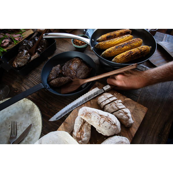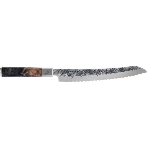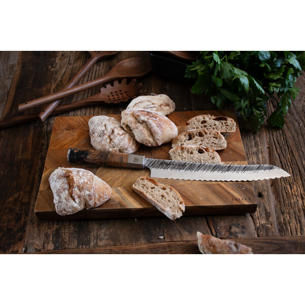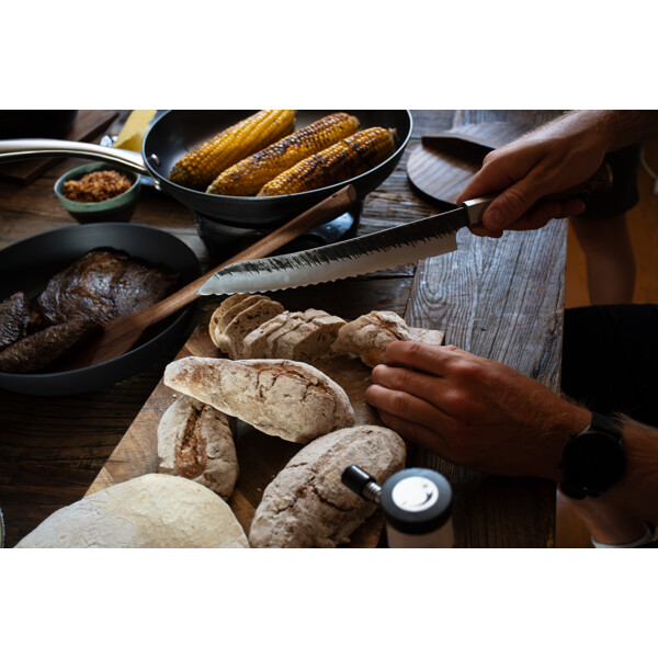 Das Satake Ame Brotmesser ist ein 23 cm langes Messer mit sowohl funktionellem als auch schönem Design. Die Klinge ist leicht gebogen und die abgerundeten, einseitig geschliffenen Zähne haben einen sanft wechselnden Winkel, wenn man Front, Mitte und Ferse vergleicht. Alles, um das perfekte Schneidegefühl zu bieten, egal ob es sich um ein Frühstücksbrötchen, ein Sauerteigbrot oder ein gedämpftes Bao handelt, das aufgeschnitten werden soll.