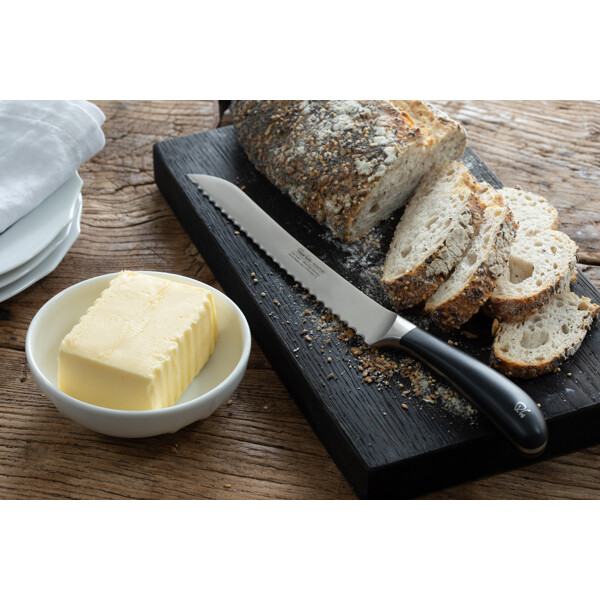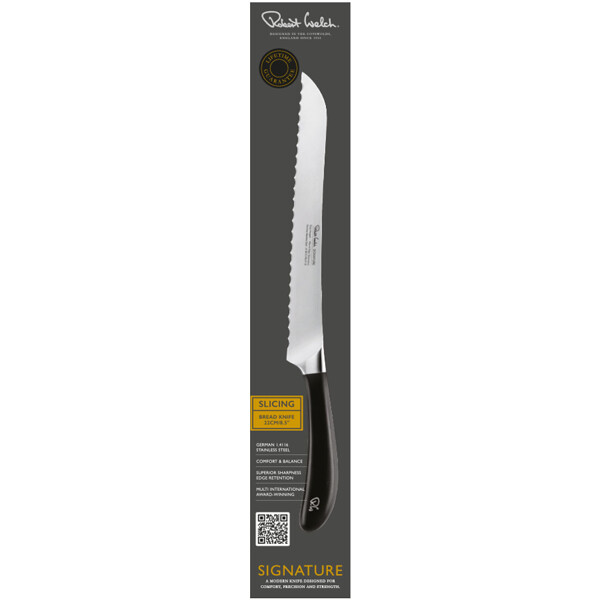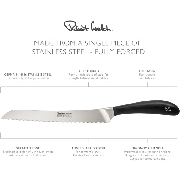 Die Signature Brotmesser 22 cm hat eine gezahnte Klinge mit einer spitzen Spitze, die perfekt zum Schneiden von knusprigem Brot, Baguettes und Kuchen geeignet ist. Hergestellt aus deutschem Edelstahl mit einem ergonomischen DuPont™-Griff. Alle Robert Welch Signature Messer werden in einer eleganten Geschenkbox geliefert, sind spülmaschinenfest und haben 25 Jahre Garantie.