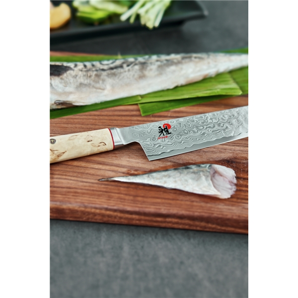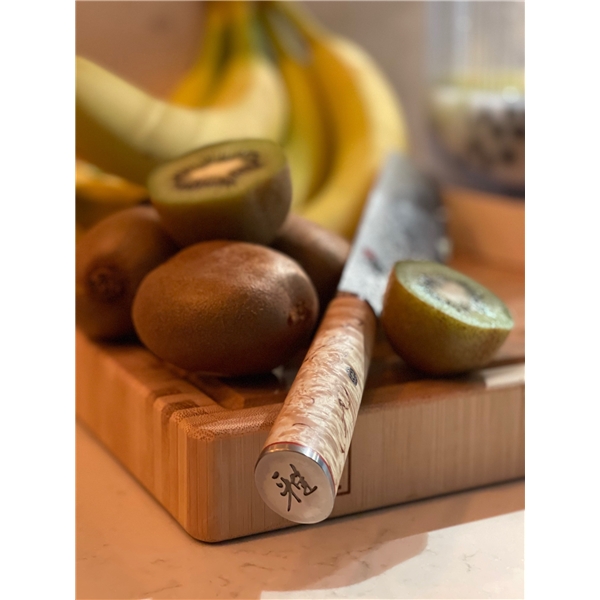 Das Rocking Santoku aus der Serie Birch 5000MCD von MIYABI ist eine Ergänzung zum europäischen Kochmesser und kann für alles verwendet werden, was Sie in Ihrer Küche tun müssen. Die hohe, kurze CRYODUR-Klinge ist beidseitig geschliffen und hat einen extra harten Kern aus Micro Carbide-Pulverstahl MC63, umgeben von insgesamt 100 Stahllagen. Das Messer von unglaublicher Qualität hat eine scharfe Klinge aus Mikro-Karbid-Pulverstahl und einen Kern, der mit 132 Stahllagen bedeckt ist. Handwäsche empfohlen.
