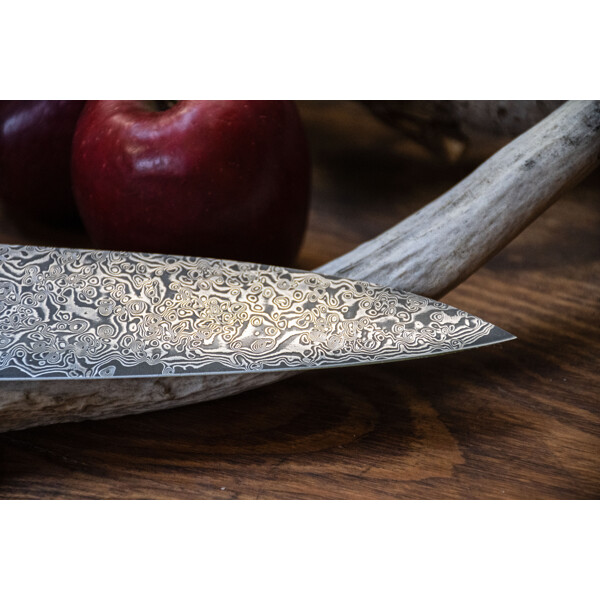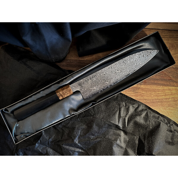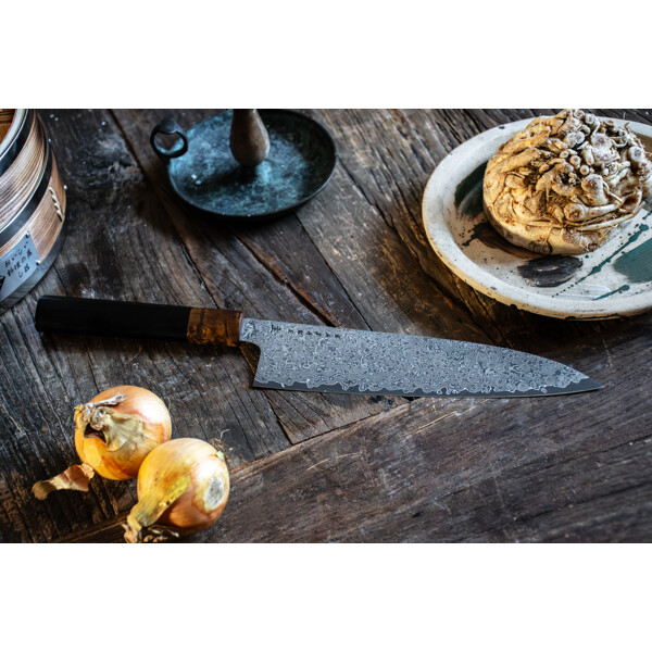 Gyuto steht oft für westlich gestaltete Kochmesser, aber in Japan ist gyūtō tatsächlich das Wort für "Rindfleischmesser". Das westliche Kochmesser ist länger und hat eine stärker zulaufende Form als das japanische Santoku. Die schmalere Spitze ist perfekt für Detailarbeiten, während die robustere Klingenlänge sich gut zum Schneiden und Tranchieren von Fleisch, aber auch von Fisch und Gemüse eignet.