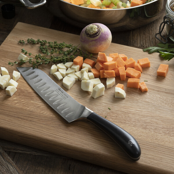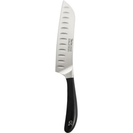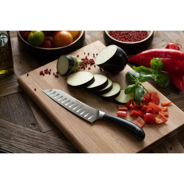 Die Signature Santokumesser 17 cm hat einen japanischen Stil mit breiter Klinge. Das Santokumesser eignet sich besonders für präzises Schneiden und Würfeln von Gemüse. Die Vertiefungen auf der Klinge verringern die Reibung und erleichtern das Schneiden.