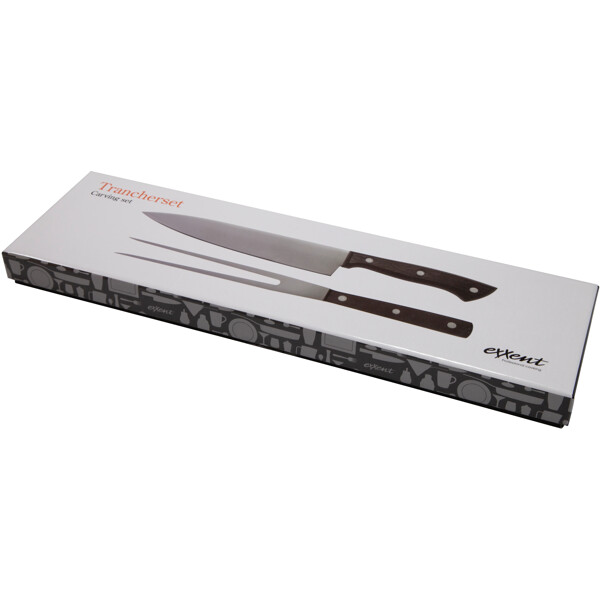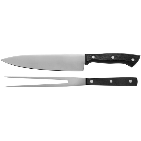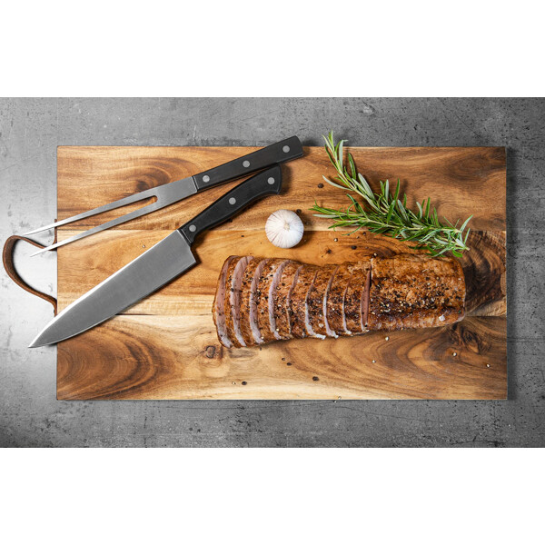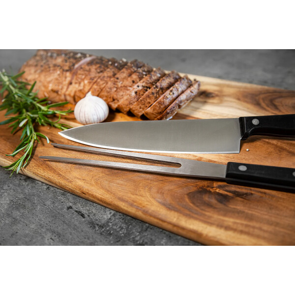 Praktisches Tranchier-Set aus der Serie Roma, das Ihnen hilft, Fleisch oder Geflügel einfach und mühelos zu schneiden. Die Klinge ist aus X50CrMoV15 Stahl gefertigt. Die Griffe bestehen aus POM, das langlebig und beständig ist. Enthält eine Fleischgabel und ein 20 cm Kochmesser.