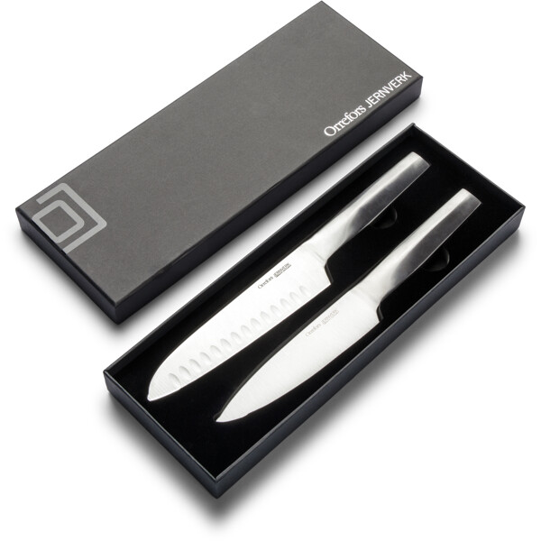 Küchenmesser mit Design von Jon Eliason mit durchdachtem Griff kommen in einer schönen Geschenkbox, was sie zu einem perfekten Geschenk macht. Enthält Santoku- & Küchenmesser.
