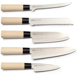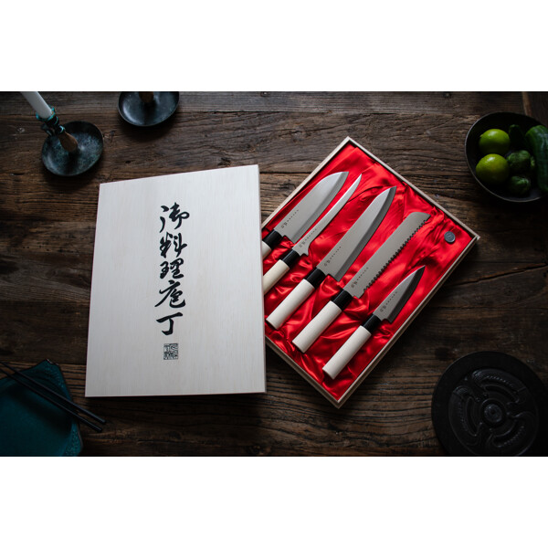 Das Messerset enthält ein 7 cm flexibles Filetiermesser, ein 20 cm Brotmesser, ein 17 cm Santoku-/Kochmesser, ein 21 cm Gyuto-/Kochmesser und ein 12 cm Petty-/Schälmesser in einer schönen Balsabox.