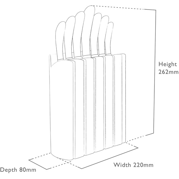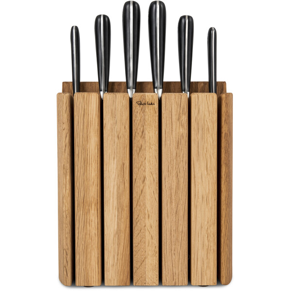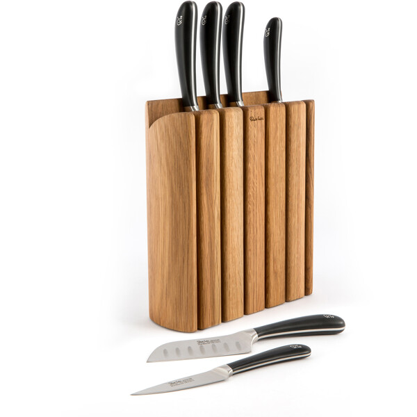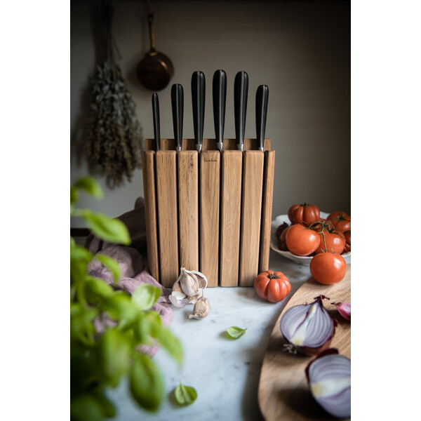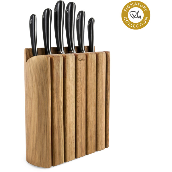 Messerblock aus massivem Eichenholz in der Signature-Serie. Ideal, um es an eine Wand zu stellen und wertvollen Platz in der Küche zu sparen. Der Block wird mit 6 mehrfach preisgekrönten Signature-Messern geliefert.