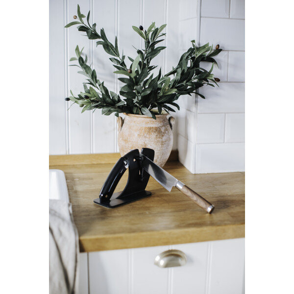 Mit dem Kali Messerschärfer erhalten Sie einen praktischen Messerschärfer, der sowohl ein beschädigtes Messer schärft als auch feinschleift und zudem fest auf dem Tisch steht. Dank des Griffs können Sie außerdem beim Schärfen Ihrer Messer zusätzlichen Druck ausüben.