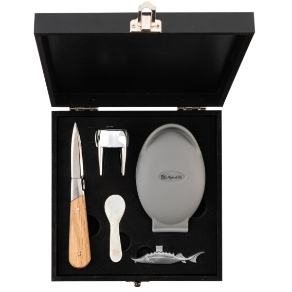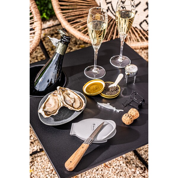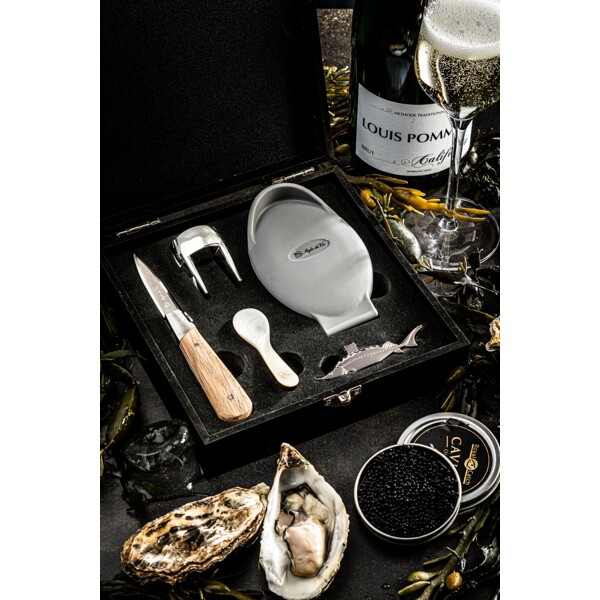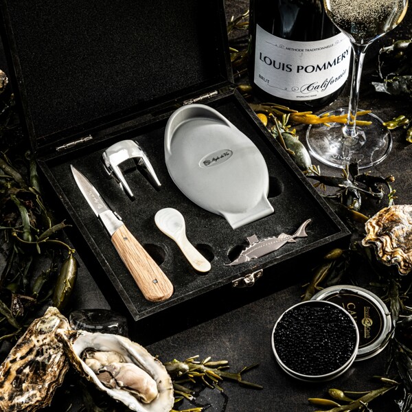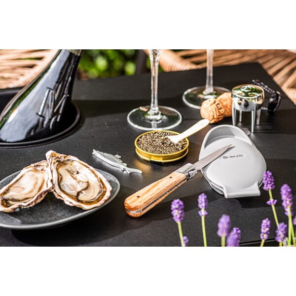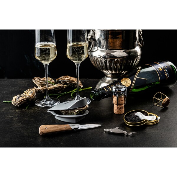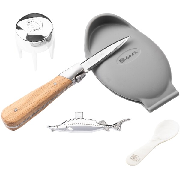 Geschenkset mit einem Öffner für eine Flasche Sekt, einem Kaviarlöffel, einem Kaviardosenöffner, einem Austernmesser und einem Silikonhalter für Austern. Tauchen Sie ein in eine Welt ultimativer Raffinesse mit dem exklusiven Geschenkset von Laguiole Style de Vie. Eine Symphonie aus erschwinglichem Luxus und Eleganz. Jedes Objekt in diesem Set wurde sorgfältig ausgewählt, um den höchsten Ansprüchen an Geschmack und Stil gerecht zu werden. Perfekt für diejenigen, die die feineren Dinge im Leben schätzen. Vom mühelosen Öffnen einer Flasche Champagner, Cava oder Prosecco bis hin zum delikaten Servieren von Kaviar mit dem schönen Löffel aus Schale. Und mit dem Kaviardosenöffner öffnen Sie diese luxuriösen Delikatessen mit Leichtigkeit. Das Austernmesser bietet Präzision, während der Silikonhalter zusätzlichen Halt gibt. Mit diesem Set können Sie jeden Anlass in eine Feier des Luxus verwandeln!