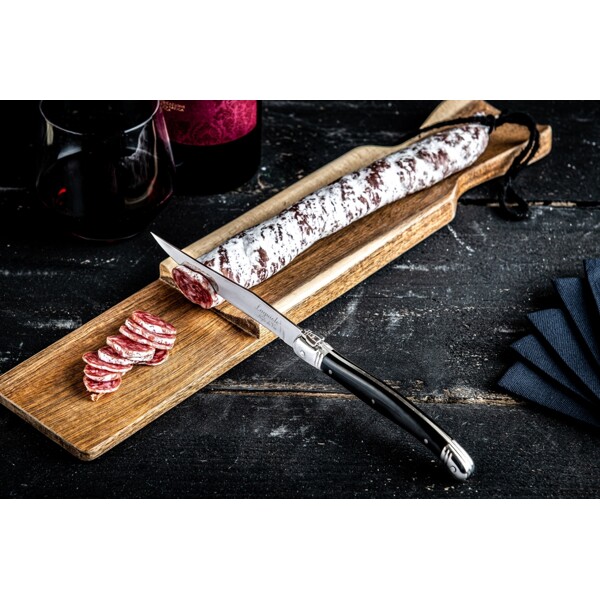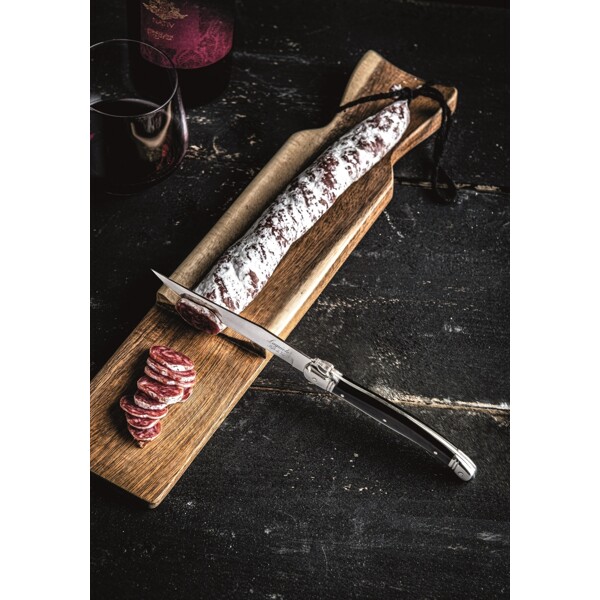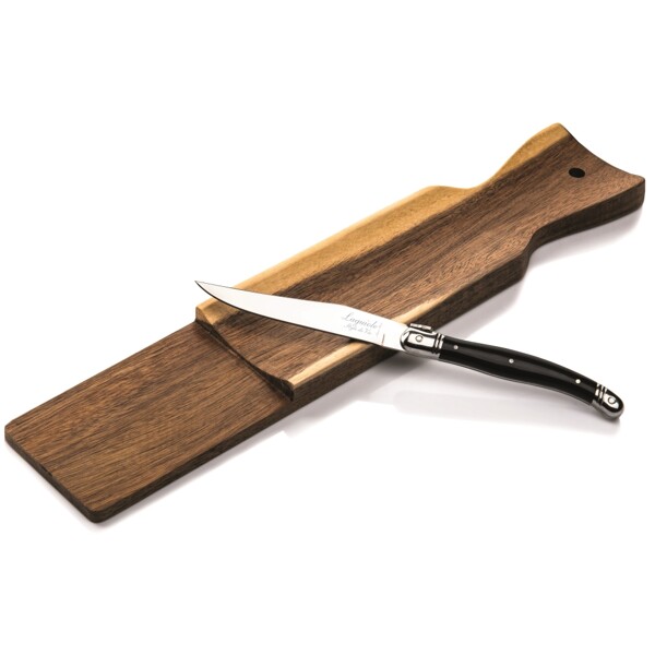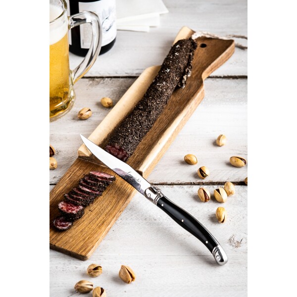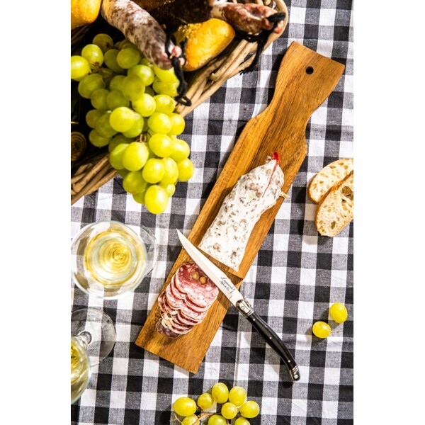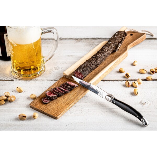 Schneidebrett aus Akazienholz, das sich zum Schneiden von Wurst, aber auch von Käse eignet. Das Schneidebrett ist leicht gewölbt, um die Wurst an Ort und Stelle zu halten. Dazu gehört ein Messer aus rostfreiem Stahl mit einem Kunststoffgriff. Die Klinge ist 1,2 mm dick und spülmaschinenfest, das Schneidebrett wird von Hand gewaschen.
