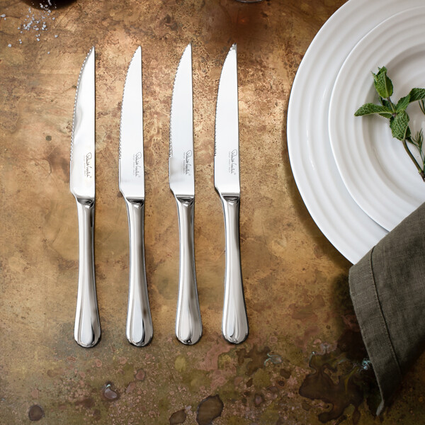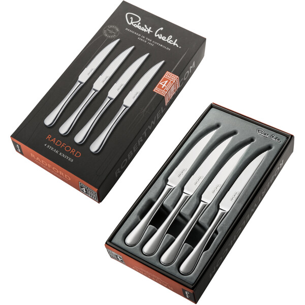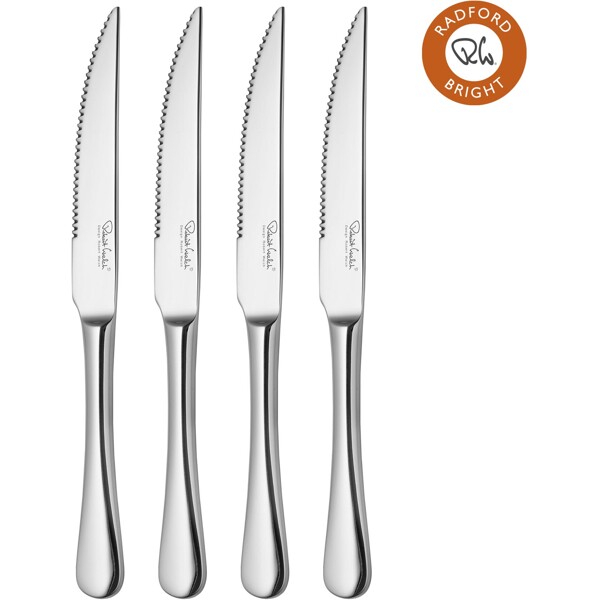 Ein 4-teiliges Steakmesser-Set in Geschenkverpackung aus der zeitlosen Radford Bright-Besteckserie. Hergestellt aus speziell gehärtetem Edelstahl mit einer spiegelpolierten Oberfläche. Radford Bright-Besteck betont jede Tischdekoration mit seinem klassischen Design und seiner Vielseitigkeit. Die Radford-Serie ist mehrfach preisgekrönt, besteht aus über 80 Teilen und ist die größte Besteckkollektion aus Edelstahl weltweit. Radford Steakmesser kommen in einer eleganten Geschenkverpackung, sind spülmaschinenfest und haben eine lebenslange Garantie.