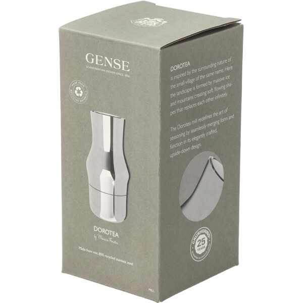 Die Dorotea-Mühlen sind aus recyceltem Edelstahl gefertigt. Das bedeutet, dass der Edelstahl, wie man so schön sagt, ein früheres Leben hatte. Abgesehen davon, dass er extrem langlebig ist, kann Edelstahl eingeschmolzen und in neue Produkte umgewandelt werden, ohne seine Eigenschaften und Qualitäten zu verlieren. Edelstahl kann unendlich oft wiederverwendet werden und ist daher ein Material, das immer weitergibt.