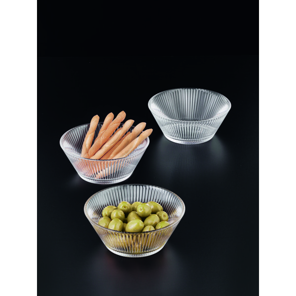 Die sanft geschliffenen Linien im Glas fangen das Licht ein und reflektieren es, was einen schönen Effekt auf dem Tisch erzeugt und die Farben der servierten Speisen hervorhebt. Die Aperitivo-Serie wurde geschaffen, um in den entspannten Stunden zwischen Arbeitstag und Abendessen zu glänzen, und diese Schale ergänzt die Gläser der Serie auf elegante Weise.