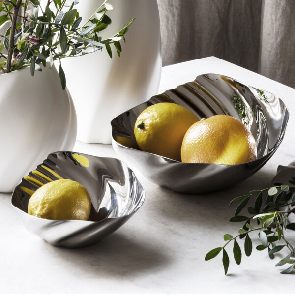 Die spiegelpolierten Cascade-Schalen kommen besonders schön in Kombination mit den satinierten Vasen der Serie zur Geltung. Der Kontrast zwischen Material und Finish hebt die Bewegung im Design hervor und macht den Ausdruck lebendig.