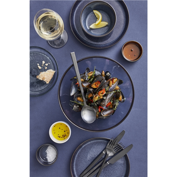 BITZ Gastro Schale aus Steinzeug mit matter schwarzer Glasur auf der Außenseite und glänzender dunkelblauer Innenseite. Erhältlich in mehreren Größen mit unbegrenzten Verwendungsmöglichkeiten. Verwenden Sie sie z.B. für Oliven, Nüsse und Snacks, Dips und Dressings, Schokolade, Beeren und Obststücke. Aufgrund des Herstellungsprozesses gibt es sowohl Farbunterschiede als auch Variationen in der Glasur, was jedem Exemplar ein völlig einzigartiges Aussehen verleiht.