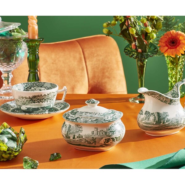Heritage Green Italian Zuckerschale mit Deckel 0,25 L ist eine charmante Ergänzung zur Tee- oder Kaffeestunde. Mit dem gleichen ikonischen Motiv wie Spodes klassisches Blue Italian – hier in einem eleganten Grünton – vereint sie Tradition mit aktualisierter Farbgebung und zeitloser Schönheit.Das Motiv ist inspiriert von der malerischen italienischen Landschaft und wird von dem charakteristischen Imari-Oriental-Muster aus dem 18. Jahrhundert eingerahmt, das um den Rand der Schale verläuft. Der praktische Deckel hält den Inhalt frisch, und die ausgewogene Form der Schale macht sie sowohl schön als auch funktional auf dem Tisch.Hergestellt in Stoke-on-Trent, England – wo die britische Porzellankunst über Generationen hinweg verfeinert wurde.