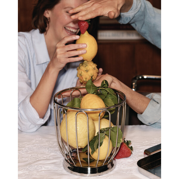 Zitruskorb aus Edelstahl in Drahtarbeit. Seit 1952 in Produktion, ist diese Schale zu einem Klassiker geworden, ein wahrhaft "essentieller" Gegenstand. Mit ihren Proportionen, Leichtigkeit und Funktion ist sie die Inspiration hinter allen Obstschalen von Alessi.