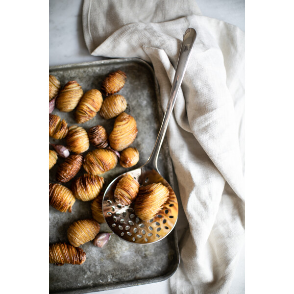 Robert Welch Signature Küchenutensilien sind aus 18/10 Edelstahl gefertigt. Die Utensilien haben einen ellipsenförmigen Griff, der einen bequemen Halt in der Hand bietet. Am Ende des Griffs befindet sich ein Haken, der es einfach und elegant macht, die Utensilien an einer Leiste aufzuhängen.