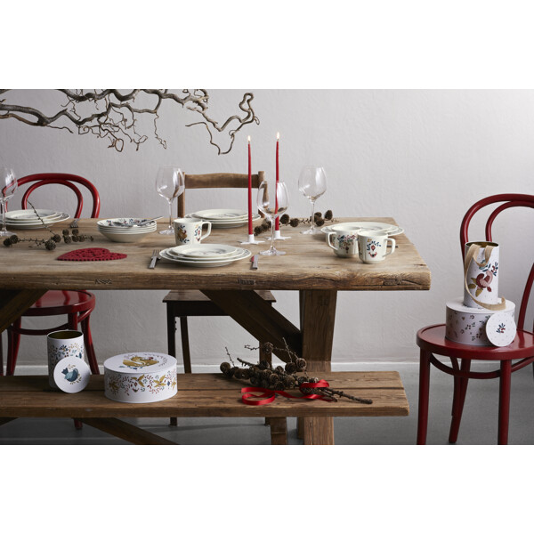 Moderne Nostalgie und Wärme für all die gemütlichen Momente in den kalten Monaten. Das ikonische weiße Grand Cru-Geschirr, ein minimalistischer Klassiker von Rosendahl, wurde für herbstliche Gemütlichkeit und Weihnachtsstimmung mit den maximalistischen Illustrationen der Norwegerin Fam Irvoll neu gestaltet. Auf kreative und spielerische Weise lässt sie sich von der Vergangenheit inspirieren und schafft mit der Grand Cru Cottage-Serie einen modernen und stimmungsvollen Ausdruck. Auf den Tellern, Schalen, Tassen und Vorratsdosen der Serie trifft die nordische Natur auf klassische Weihnachtsmotive und Vintage-Schmuck in einem wunderbaren Zusammenspiel. Die Grundelemente von Grand Cru Cottage sind Blätter und Zweige, Beeren, Sanddorn, Vögel, Honigherzen, Glasdekorationen und Eicheln, die in einer einzigartigen Komposition auf jedem Teil des Geschirrs angeordnet sind. Grand Cru Cottage ist wie eine Familie, in der alle Familienmitglieder grafische Elemente innerhalb derselben Farbpalette enthalten, sodass jedes Teil einzigartig, aber dennoch harmonisch ist. Gemeinsam ist allen Motiven der Serie, dass der süße und nostalgische Ausdruck eine extra gemütliche Atmosphäre schafft, die das Geschirr zu Ihrem neuen Favoriten im Herbst und in der Weihnachtszeit macht – sowohl im Alltag als auch, wenn Gäste zu Besuch kommen.