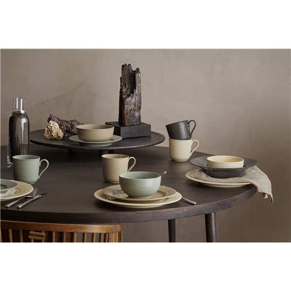 Ein bodenständiger und präsenter Ausdruck auf dem Tisch. Mit einer Farbpalette in vier eleganten Erdtönen lädt Rhombe Earth uns ein, langsamer zu werden, bei der Mahlzeit präsent zu sein, die Menschen, mit denen wir essen, wahrzunehmen und die Schönheit des Geschirrs zu bemerken. Der Pastateller der Serie mit einem Durchmesser von 24,5 cm, der auch perfekt für Suppe geeignet ist, hat die dunkelgraue Farbe Slate, die wie die anderen gedämpften Erdtöne in Rhombe Earth das ikonische Reliefmuster des Rhombe-Geschirrs auf eine neue und andere Weise hervorhebt. Er lädt uns ein, einen Schritt tiefer zu gehen und die Speisen auf dem Teller, die Sinne und das Gespräch mit den anderen am Tisch zu beachten. Alle vier schönen Farben der Rhombe Earth-Serie – Marble, Clay, Moss und Slate – sind, genau wie in der beliebten Rhombe Color-Serie von Lyngby Porcelæn, sorgfältig von dem Design-Duo Stilleben ausgewählt, das aus Ditte Reckweg und Jelena Schou Nordentoft besteht. Verwenden Sie die verschiedenen Rhombe Earth-Teile zusammen in Ihrer Tischdekoration und lassen Sie die verschiedenen Größen der Teller untereinander hervorschauen, sodass die warmen Farben miteinander sprechen können. Die Teller, Tassen und Schalen in Rhombe Earth sind natürlich auch perfekt sowohl zusammen als auch einzeln als Ergänzung zu Ihrer Rhombe Color-Sammlung oder in Kombination mit dem klassischen weißen Rhombe-Geschirr, wobei die grauen und braunen Nuancen der Rhombe Earth-Teile zusammen mit den Linien von Lyngby Porcelæn einen modernen und entspannten Ausdruck schaffen und schön gegen das weiße Porzellan stehen.