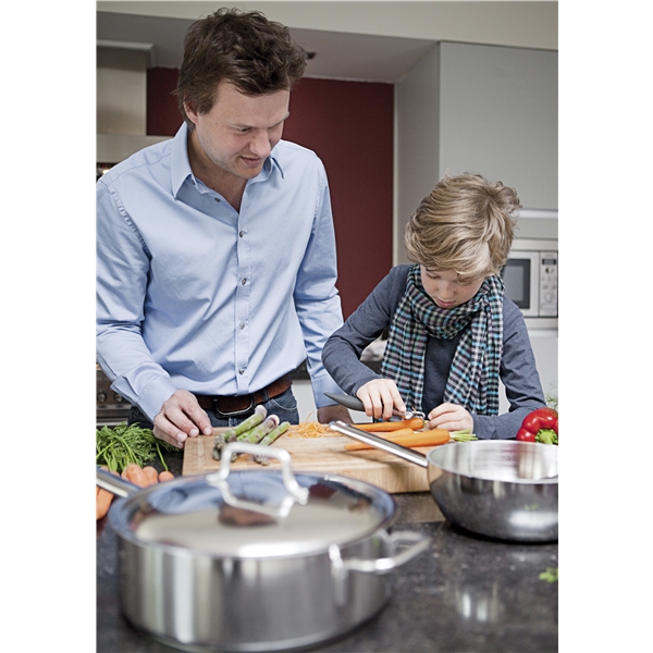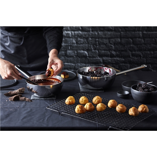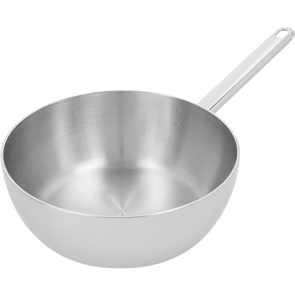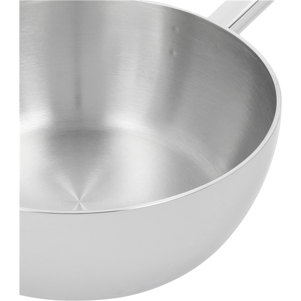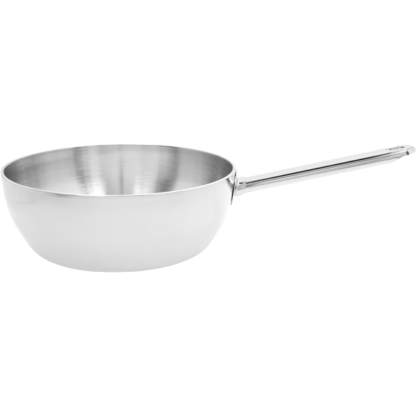 Apollo Sauteuse ohne Deckel von Demeyere aus Edelstahl. Ein hochwertiger Topf, der sich perfekt für die Zubereitung von Suppen, Eintöpfen oder Cremes eignet. Die Sauteuse bietet eine hervorragende Wärmeverteilung dank des siebenschichtigen Edelstahls, der eine schnelle und effiziente Erwärmung und Verteilung der Wärme ermöglicht. Das minimalistische Design und die runde Form des Kochgeschirrs machen es einfach, überall mit Löffeln, Schneebesen oder anderen Küchenutensilien zu erreichen.