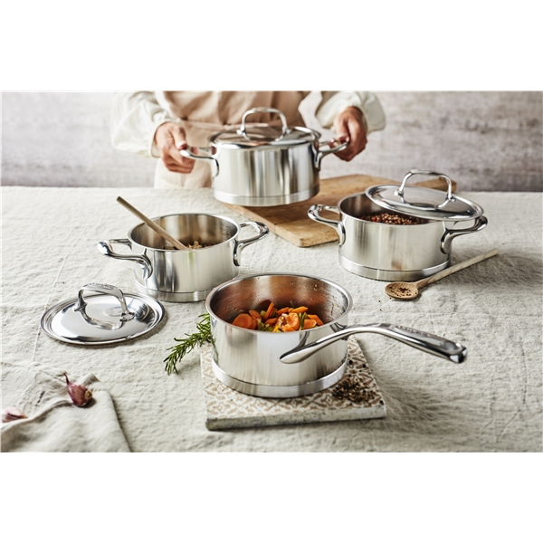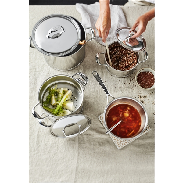 Topf mit Deckel aus der Atlantis-Serie von Demeyere. Ein hochwertiges Kochgeschirr aus Edelstahl mit perfekter Wärmeverteilung dank des speziellen InductoSeal®-Bodens aus Edelstahl und einem Aluminiumkern. So sparen Sie viel Zeit und müssen das Essen nicht ständig im Auge behalten. Der Topf verfügt außerdem über eine spezielle Silvinox®-Oberfläche, die die Reinigung erleichtert und die charakteristische silberweiße Farbe des Edelstahls über lange Zeit bewahrt, sodass Fingerabdrücke schnell und einfach entfernt werden können. Mit diesem unglaublich schönen und langlebigen Topf von Demeyere können Sie im Handumdrehen zartes Fleisch, bissfestes Gemüse und herrlich duftende Saucen braten, schmoren oder dämpfen.