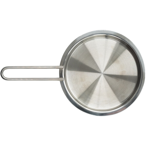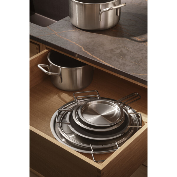 Flacher Topfdeckel von Eva Trio. Der Topfdeckel hat einen langen Griff an der Seite, damit man sich nicht verbrennt, wenn man das Essen überprüft. Während des Kochens können Sie andere Gerichte auf dem Deckel warmhalten und darauf stapeln. Alle Deckel passen zu allen Eva Trio-Topfserien und Materialien.