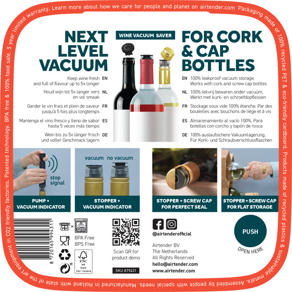 Mit diesem Set holen Sie die gesamte Airtender-Vakuumkollektion in Ihr Zuhause! Halten Sie den Wein länger frisch, in der Flasche.