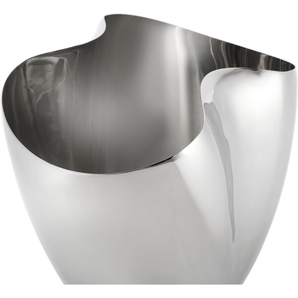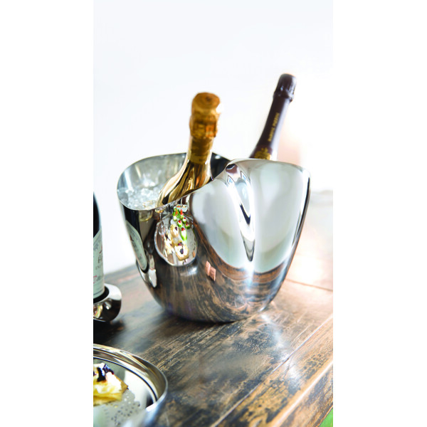 Der Kühler ist aus hochglanzpoliertem 18/10 Edelstahl gefertigt und ist äußerst langlebig. Die sanfte Form sorgt für wunderschöne Lichtreflexionen und macht den Kühler zu einem natürlichen Blickfang und Mittelpunkt. Dies ist das größere Modell und misst 21,5 cm in der Tiefe, 23 cm in der Höhe und 28 cm in der Breite.