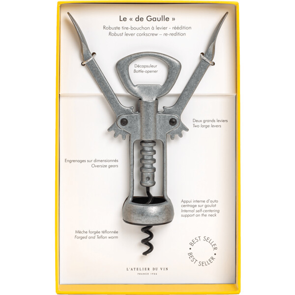 Der bekannte De Gaulle Korkenzieher und Folienschneider von der französischen Marke L`atelier du vin. Dieser ikonische Korkenzieher ist ein Muss für zu Hause. Mit einem Kopf und zwei großen Griffen, die wie Arme aussehen, ist er weltweit bekannt. Er hat seinen Namen aus Frankreich, als De Gaulle seine Arme hob, während er zu seinem Publikum sprach. L`atelier du vin hat jede Komponente des Korkenziehermechanismus sorgfältig ausgewählt, um sicherzustellen, dass er robust und einfach zu bedienen ist. Dieser Korkenzieher ist mit Teflon beschichtet und verfügt über ein Fünf-Stufen-Verfahren, um den Korken korrekt und einfach zu greifen und herauszuziehen.