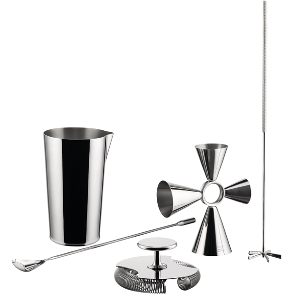 Set bestehend aus: Mixerglas, "Quadri Combo Jigger", Doppelsieb, Mixlöffel und "Baton Lélé" Rührer aus 18/10 Edelstahl.