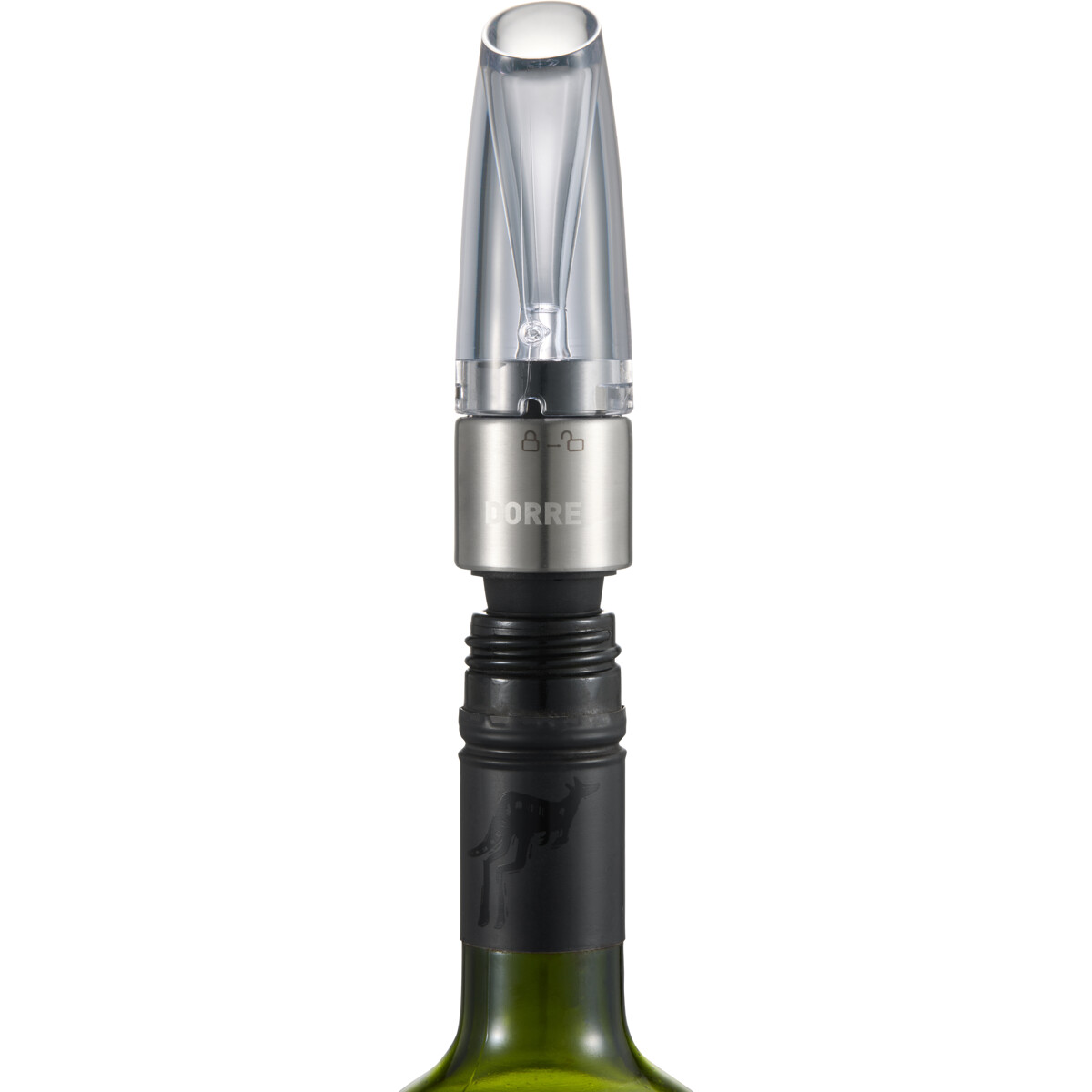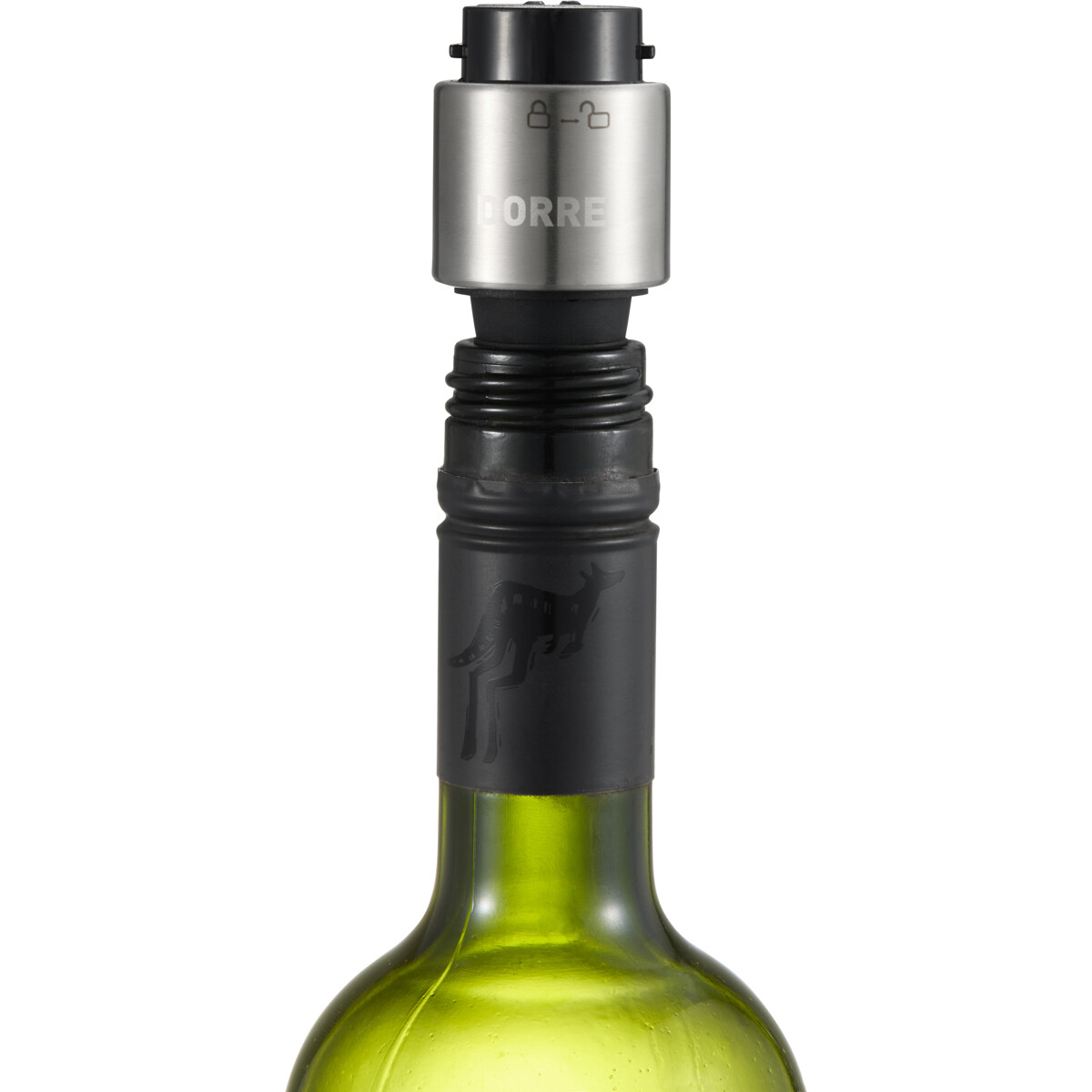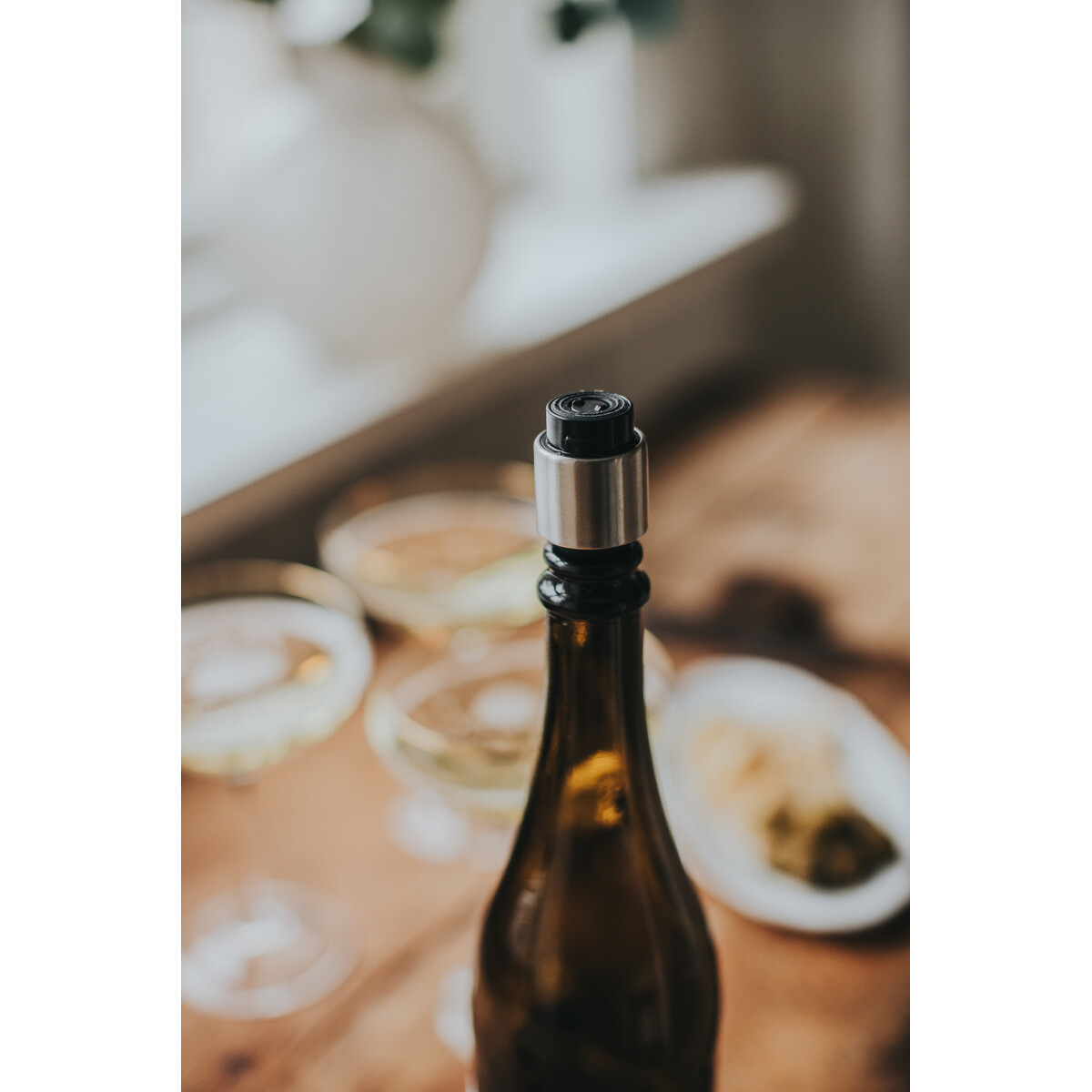 Verne Weindekanter und Weinverschluss in einem bieten auf einfache Weise sowohl ein besseres Aroma als auch eine längere Haltbarkeit. Das stilvolle schwarze Design passt zu allen Flaschen und macht das Servieren einfacher. Ein cleveres Werkzeug, das das Weinerlebnis sowohl bei Alltagsessen als auch bei festlicheren Anlässen verbessert.